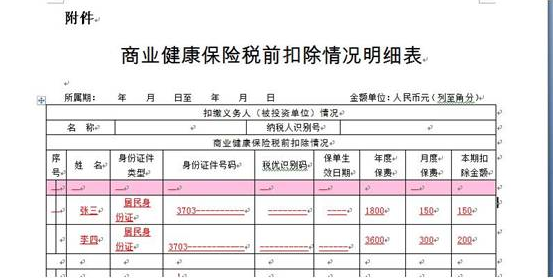 例如:張三、李四在A公司上班,每月稅前工資5000元。張三自行繳納商業(yè)健康保險(xiǎn)1800元/年,李四自行繳納商業(yè)健康保險(xiǎn)3600元/年,兩人均需向單位財(cái)務(wù)提供帶“稅優(yōu)識(shí)別碼”的保單憑證,單位財(cái)務(wù)人員在報(bào)稅時(shí)需要在填報(bào)《扣繳個(gè)人所得稅報(bào)告表》申報(bào)表,稅前扣除項(xiàng)—“其他”欄次,并同時(shí)填報(bào)《商業(yè)健康保險(xiǎn)稅前扣除情況明細(xì)表》