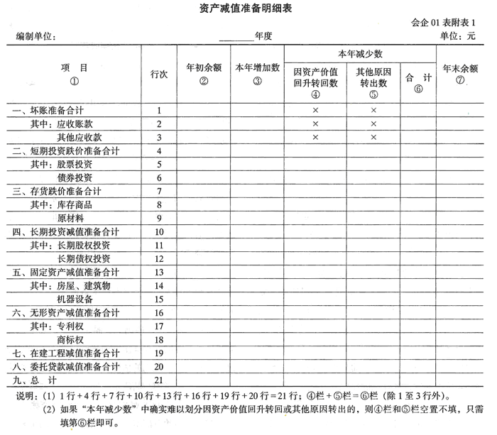 答:根據(jù)《企業(yè)會計制度》及相關(guān)會計準(zhǔn)則的規(guī)定,企業(yè)應(yīng)在對外提供的財務(wù)報告中披露有關(guān)資產(chǎn)減值準(zhǔn)備的信息。企業(yè)在會計報表附注中披露資產(chǎn)減值準(zhǔn)備減少的信息時,應(yīng)區(qū)分由于資產(chǎn)價值回升而產(chǎn)生的資產(chǎn)減值準(zhǔn)備轉(zhuǎn)回的金額和由于其他原因(如出售該項資產(chǎn)、非貨幣性交易、債務(wù)重組等)所轉(zhuǎn)出的資產(chǎn)減值準(zhǔn)備的金額兩類信息。有關(guān)資產(chǎn)減值準(zhǔn)備明細(xì)表改按以下格式編報: